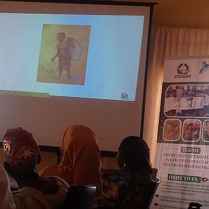 The scene is an indoor presentation or meeting held in Gumel, Nigeria. A large projection screen dominates the upper left, displaying a sepia-toned image of a young, shirtless male child wearing shorts, carrying a sack over his left shoulder and holding a tool in his right hand. Below this image, a small logo with stylized human figures is visible on the screen. To the right of the screen, a vertical banner for "CRUDAN" is partially visible. The banner's theme is "ERADICATION OF CHILD LABOR IN GINGER SUPPLY CHAIN (SOUTHERN KADUNA) NIGERIA," with objectives listed below. In the foreground, three individuals are seated, viewed from behind, observing the presentation. The leftmost person wears a red head covering adorned with gold embellishments. The central individual wears a yellow hijab. The rightmost person has dark, braided hair and wears a patterned garment. All individuals are oriented towards the screen.
