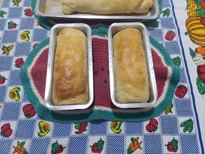 Three freshly baked loaves of bread rest on a patterned tablecloth. Two loaves are in small metal loaf pans, their golden-brown crusts glistening. The tablecloth features a repeating pattern of various fruits and vegetables on a blue and white checkered background. Each loaf rests on its own placemat, watermelon or red pattern. The third loaf, a larger rolled loaf, sits on a baking sheet at the top.