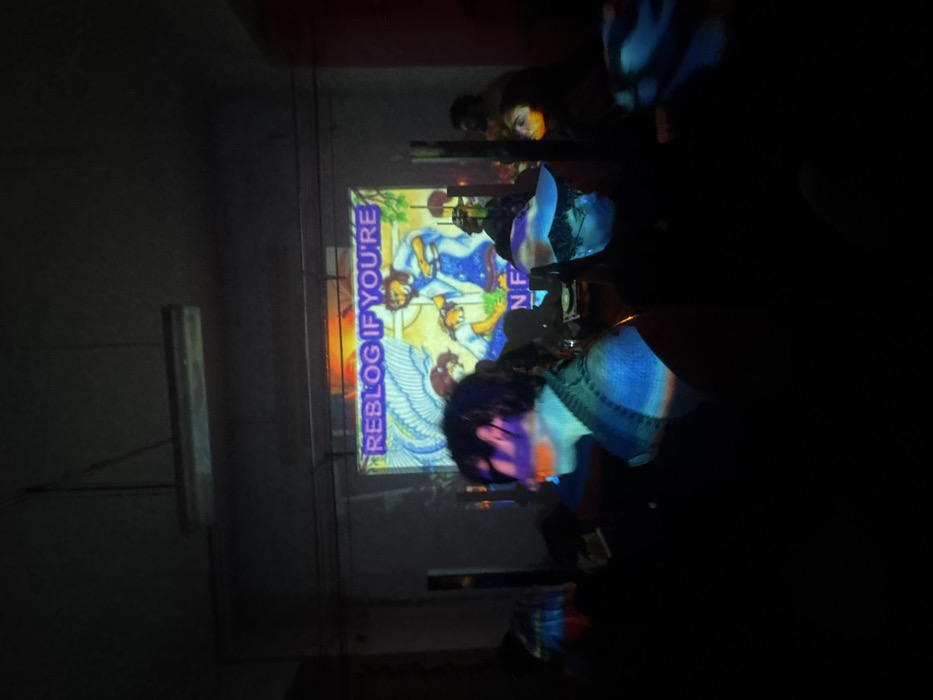 A group of people appear to be gathered in a darkened room, perhaps a classroom, watching a projected image. The image appears to be a colorful illustration with the text "REBLOG IF YOU'RE". People of different ages stand in front of the image, bathed in its light. The setting is dimly lit, with some details of the room visible in the shadows. The composition is somewhat obscured due to the darkness and the angle of the photo.