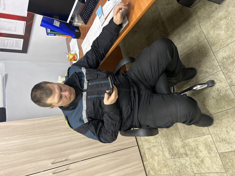 A man in a dark uniform sits in an office chair, legs crossed. He is looking at a smartphone in his hand. He sits next to a desk with a monitor, keyboard, papers, and a cup. The office has beige cabinets and tiled floors. A framed bulletin board is on the wall behind the desk.