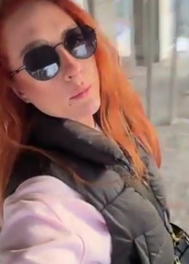 woman with long red hair, wearing dark round sunglasses, a black vest over a light pink shirt, and a black purse with a strap. She is walking inside a building with metal rails or bars on either side. She is looking at the camera and singing the lyrics "Весенняя пора, очей очарованье".