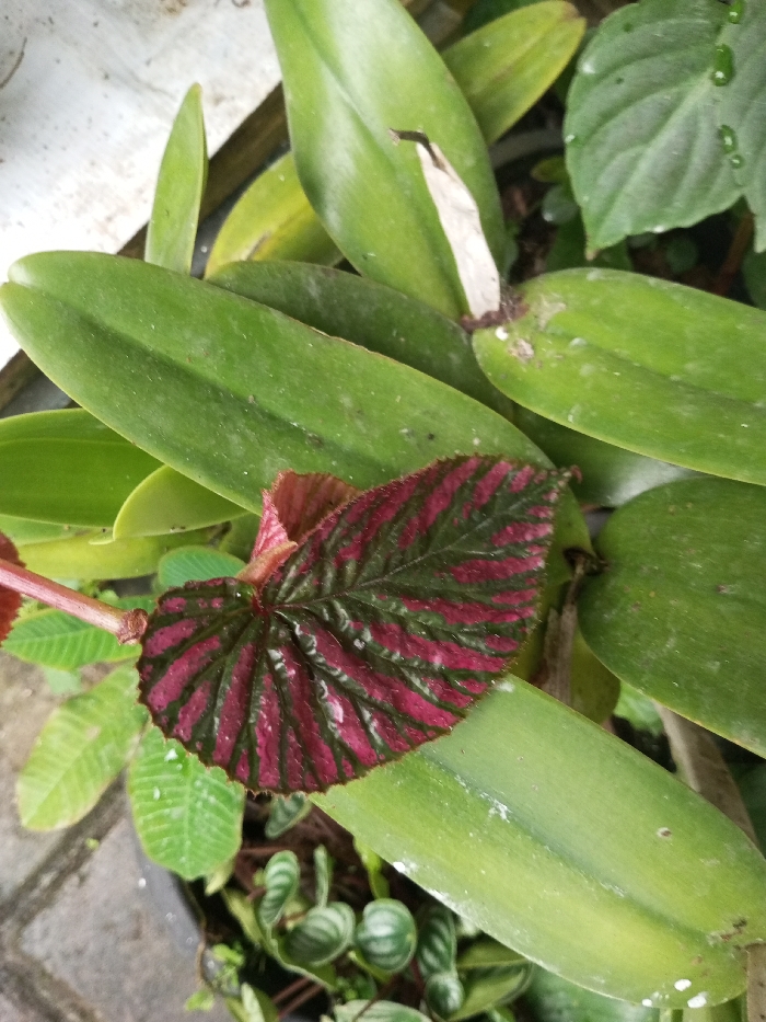 A cluster of plants includes an orchid with thick, oblong green leaves. A single, heart-shaped begonia leaf displays a pattern of dark green veins against a burgundy background, with a slightly ruffled edge. Smaller green plants with textured leaves and delicate striped patterns also fill the space.