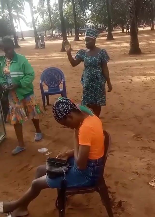 three women outdoors in a sandy area with several palm trees. One woman stands on the left wearing a green jacket and a colorful skirt, while a second woman is standing and talking on a cell phone, wearing a blue and green dress. A third woman is seated in a black plastic chair wearing an orange shirt, denim shorts, and a patterned headscarf, looking down at something in her hands. There is a blue plastic chair near the standing woman on the left. The sky is visible through the trees, and other people can be seen in the background.