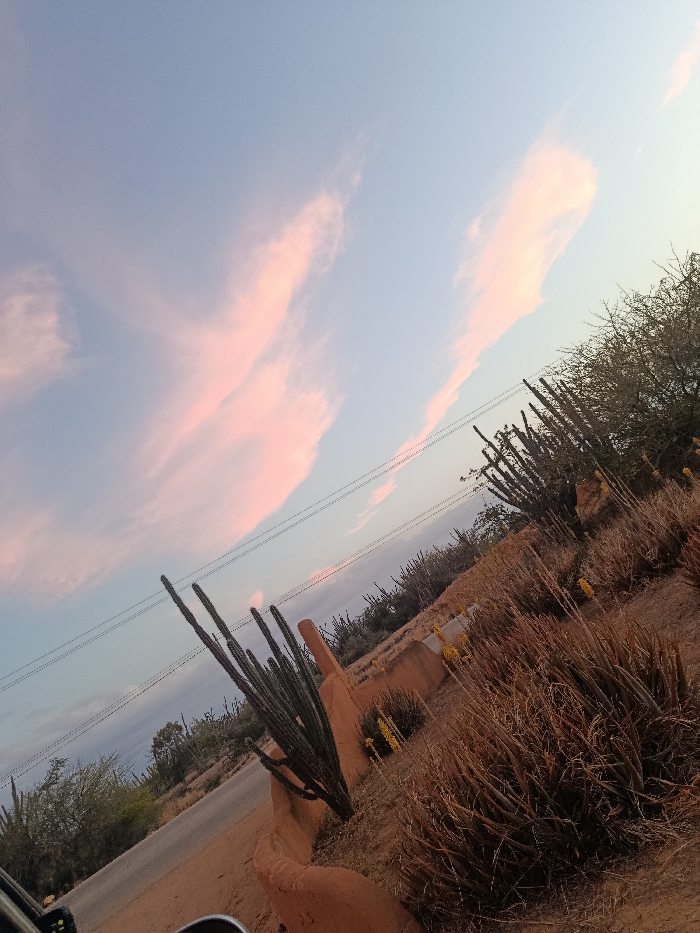 This image depicts an arid landscape in Guayacancito, Venezuela, captured at a diagonal angle during either sunrise or sunset. The sky, occupying the upper left quadrant, is a clear light blue, traversed by two prominent, elongated, parallel-aligned cirrus clouds exhibiting a distinct pink hue. Multiple utility lines, likely power or telephone wires, stretch horizontally across the middle of the frame against the sky. The midground and foreground reveal dry, reddish-brown earth and sandy terrain. Arid vegetation dominates the lower right and central portions, featuring numerous tall, multi-branched columnar cacti interspersed with clusters of dry, brownish-orange, brush-like plants, some displaying small yellow flower spikes. A paved, dark gray road curves from the lower left towards the mid-left, bordered by a low, reddish-brown concrete or earthen barrier/planter. A small, dark metallic edge, consistent with a vehicle's side mirror or door frame, is visible in the extreme bottom-left corner. No people or active interactions are visible in the scene.