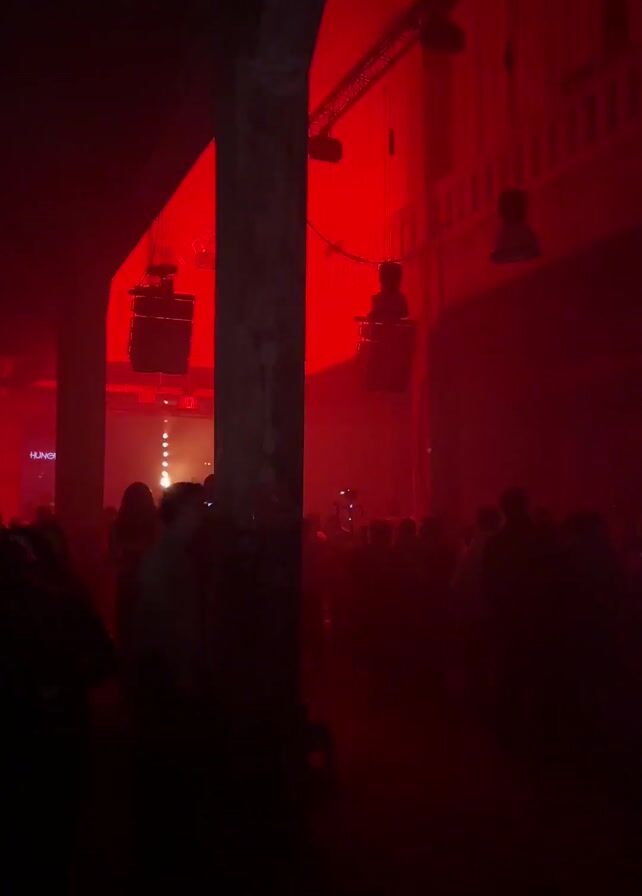 dark, smoky room filled with people. The room appears to be a large hall with high ceilings and concrete pillars. There are lights shining through the smoke, creating a hazy atmosphere. At one point, a red light illuminates part of the room. The people are mostly silhouetted against the light, and their activities are difficult to discern. A red neon sign of a snake is briefly visible.