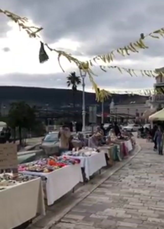 The camera pans across an outdoor marketplace on a cloudy day, with rows of tables displaying handmade items for sale, including jewelry, hair accessories, and other crafts. People are browsing and interacting with the vendors. Banners are strung overhead. In the background, a bay is visible, with hills and trees lining the far shore. Two speakers are set up near the edge of the walkway. The ground is paved with cobblestones.