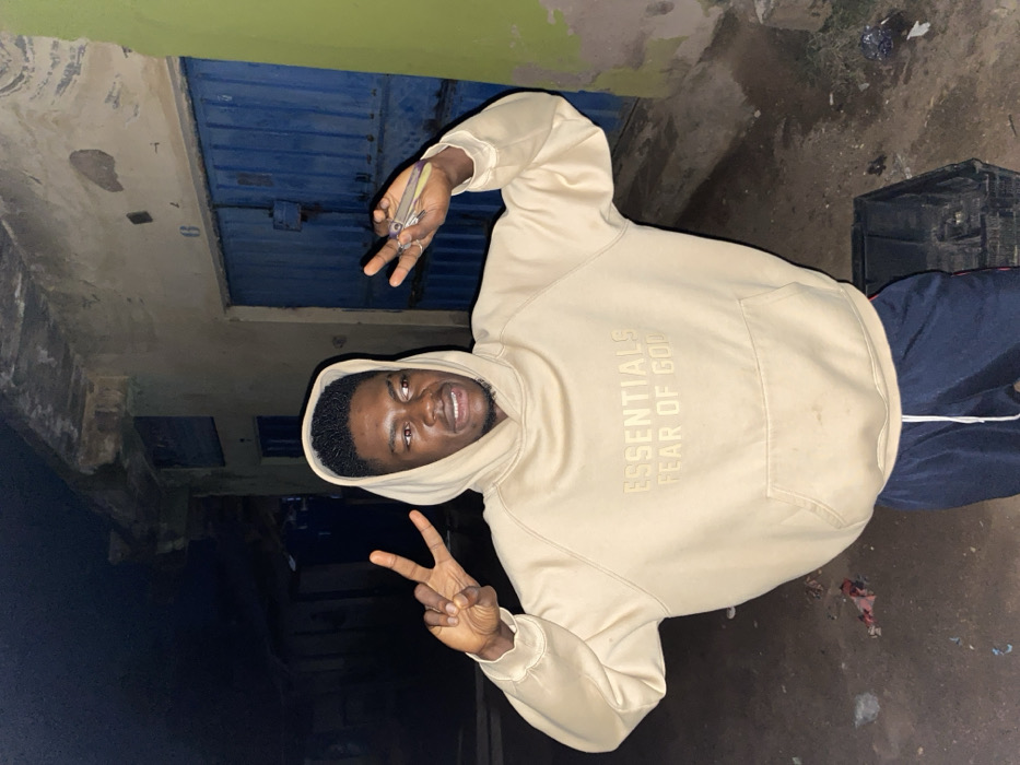 An image taken in the city of Gwong, Nigeria, depicts a young adult male posing outdoors in a dimly lit urban environment. The subject, with dark skin and dark hair, wears a light beige hooded sweatshirt with "ESSENTIALS FEAR OF GOD" text on the chest, and dark athletic pants with a white drawstring. His hood is up, covering his head. He holds his left hand (viewer's right) in a "peace" sign. His right hand (viewer's left) also forms a "peace" sign while grasping a small, multi-part object resembling a butterfly knife between his index and middle fingers. His facial expression is strained, with visible teeth. The background consists of weathered building facades; specifically, a blue double door marked with the number "6" is visible to the subject's left (viewer's right), adjacent to a green wall segment. The foreground shows unpaved ground with scattered refuse and a black plastic crate in the lower right.