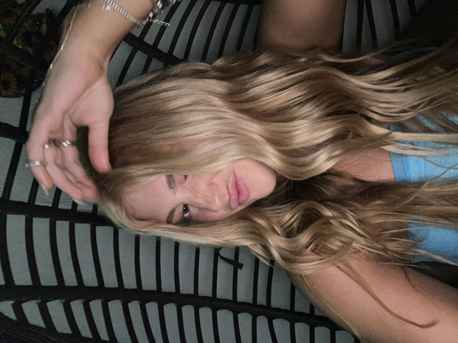 A young woman with long, wavy blonde hair is lying down, possibly on a chair or lounger with dark, striped cushions