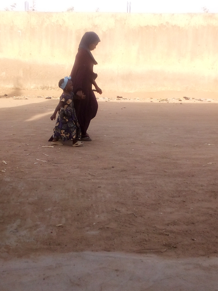 A woman in a dark robe and hijab holds the hand of a young girl in a patterned dress and blue headband. They walk across a dirt ground near a light tan building. The woman's head is bowed slightly. The girl looks forward. The scene is bathed in a soft, diffused light, suggesting a warm climate.