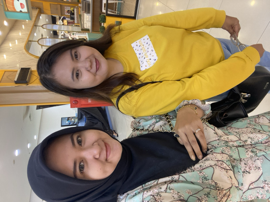 The image depicts two adult females posing indoors within a commercial establishment, specifically a shopping mall, in Sidoarjo, Indonesia