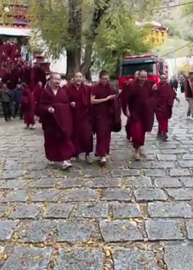 A group of monks in maroon robes walk down a stone path. The path is made of gray stones with leaves scattered on them. Behind the monks, there is a fire truck. There are trees and buildings in the background.