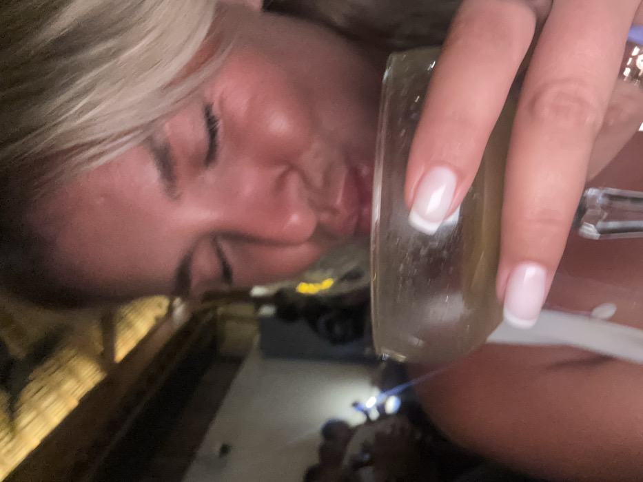 A blonde-haired individual is captured mid-close-up, with eyes closed and lips puckered in a playful expression. The individual's skin shows a reddish hue on the cheeks and forehead. A stemmed glass containing a yellowish-green liquid, possibly a cocktail, is held by the individual's right hand. The fingers gripping the glass display French manicure style nails with white tips. A gold-toned ring with an ornate design is visible on the individual's right ring finger. The background is dimly lit and out of focus, revealing blurred figures, some illuminated by small white lights, and a vertical strip of yellow light. Overhead, indistinct wooden beams and a woven or thatched ceiling material are discernible. The scene takes place within an indoor establishment, likely a bar or restaurant, in Uluwatu, Indonesia.