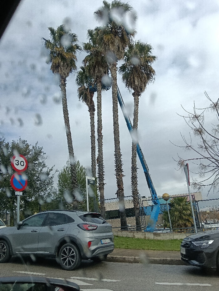 The image depicts an outdoor scene in Barberà del Vallès, Spain, viewed through a wet surface displaying numerous water droplets. The sky is overcast and grey. Dominating the upper portion of the frame are five tall palm trees, four of which are closely grouped. A blue articulated boom lift, or cherry picker, is extended upwards and positioned against one of the central palm trees, indicating ongoing tree maintenance. No individuals are visible in the scene. On the left side of the road, a circular white speed limit sign displaying '30' is mounted on a pole, directly above a circular 'no parking' sign (red diagonal line on a blue background). A silver Ford Puma SUV, bearing Spanish license plate '0074 LJZ', is parked on the right side of the asphalt road, facing left. The vehicle is situated parallel to a concrete curb and a strip of green grass, behind which a dark metal fence runs horizontally. The front section of a dark-colored vehicle is partially visible in the lower right foreground, obscuring part of the road. White dashed road markings are visible on the asphalt in the foreground. In the background, behind the fence, are additional green trees and shrubs, while bare, leafless branches of a deciduous tree are visible on the far right.