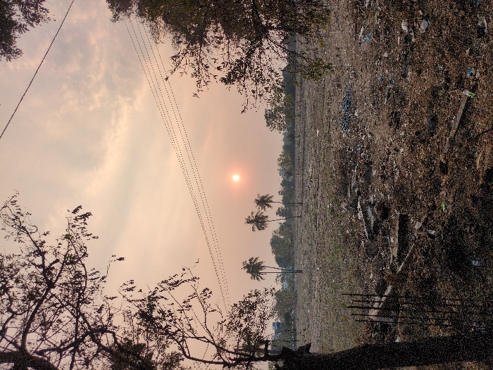 This image captures an outdoor scene in Tiruvannamalai, India, during either sunrise or sunset. The sky presents a hazy blend of soft orange and pink hues with diffused clouds. A prominent, bright orange sun disk is visible low in the sky, positioned slightly left of the horizontal center. Dark, bare tree branches extend into the frame from the upper left and partially obscure the top-left sky. Additional dark branches with some foliage enter from the upper right. Multiple dark, thin power lines stretch horizontally across the upper middle section of the image. The foreground and midground consist of a large, barren field or undeveloped lot. The ground is uneven, composed of dry earth and sparse, desiccated vegetation, and is heavily littered with various forms of debris, including broken concrete fragments, plastic bottles (a cluster of blue bottles is visible in the right midground), and other refuse. In the midground, several tall palm trees with visible fronds are positioned across the field, with additional smaller, darker trees appearing in the distant background. Vertical metal rods, possibly rebar or fence posts, are visible in the left foreground. No individuals are present.