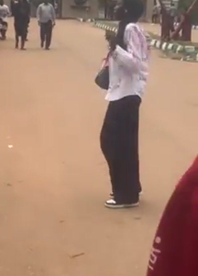 woman dancing on a road with other people walking around her. The woman is wearing a white, long-sleeved shirt, black pants, and white and black sneakers. She also has a black purse hanging from her shoulder and is wearing sunglasses. She has long, dark hair that is braided. Another woman in a red sweater and pink leggings walks past her. Other people walk around her and in the background. There is a gate with a sign in the background as well. The road is a light brown color.