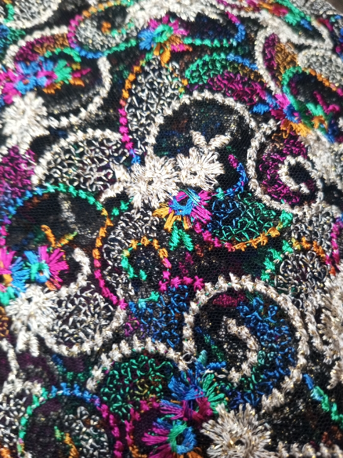 An ornate and intricate embroidery adorns a dark, net-like fabric