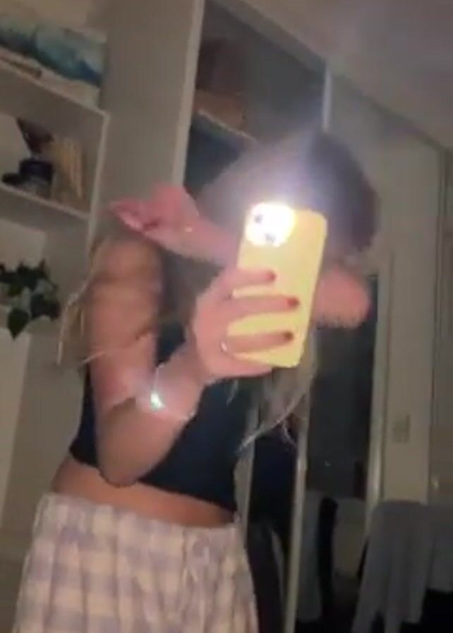 A young woman is in a bedroom holding a yellow phone with the flashlight on. She is wearing a black tank top and plaid pajama pants. She is standing in front of a mirrored closet and takes a video of herself, then turns away. A laptop, houseplant, and a gray towel are visible in the background.