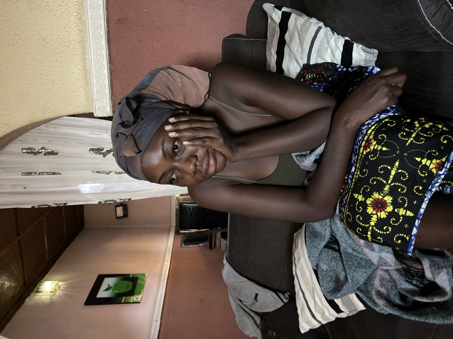 A young woman with dark skin, wrapped in a headscarf, lies on a sofa with a patterned skirt, resting her face in her hands