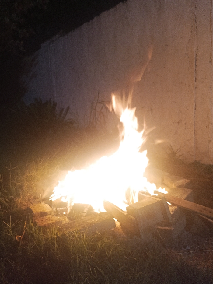 A bonfire blazes against a dark, textured wall, casting an orange glow on the surrounding grass. Flames reach upward, illuminating wooden planks and debris within the fire pit. Sparse plants are silhouetted near the wall. The setting suggests nighttime, with the fire serving as the primary light source.