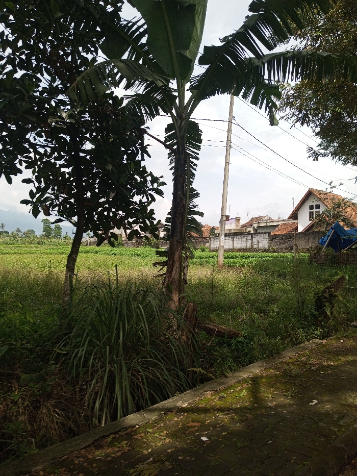 The scene depicts a semi-rural landscape in Namthoung, Laos. In the immediate foreground, a moss-covered paved walkway or path runs along the bottom and right frame, adjacent to a narrow, dark channel or ditch. Directly behind the ditch, a dense clump of tall, green, grass-like vegetation is prominent. To the left, a tree with dark green foliage stands, while a banana tree with large, partially tattered green leaves is centrally positioned, displaying a textured trunk. Beyond the vegetation, a flat, vibrant green field of low-lying crops or agricultural plants extends horizontally, terminated by a light-colored concrete wall. Above this wall, several residential buildings with reddish-brown tiled roofs are visible, including a prominent white house with a gabled roof and a small window on the right. A grey utility pole with overhead wires is situated to the right of the banana tree. Further right, a blue tarp covers an indistinct object or structure. The sky is overcast with scattered white clouds, and distant mountains are faintly visible on the horizon to the left. No individuals or active interactions are observed.