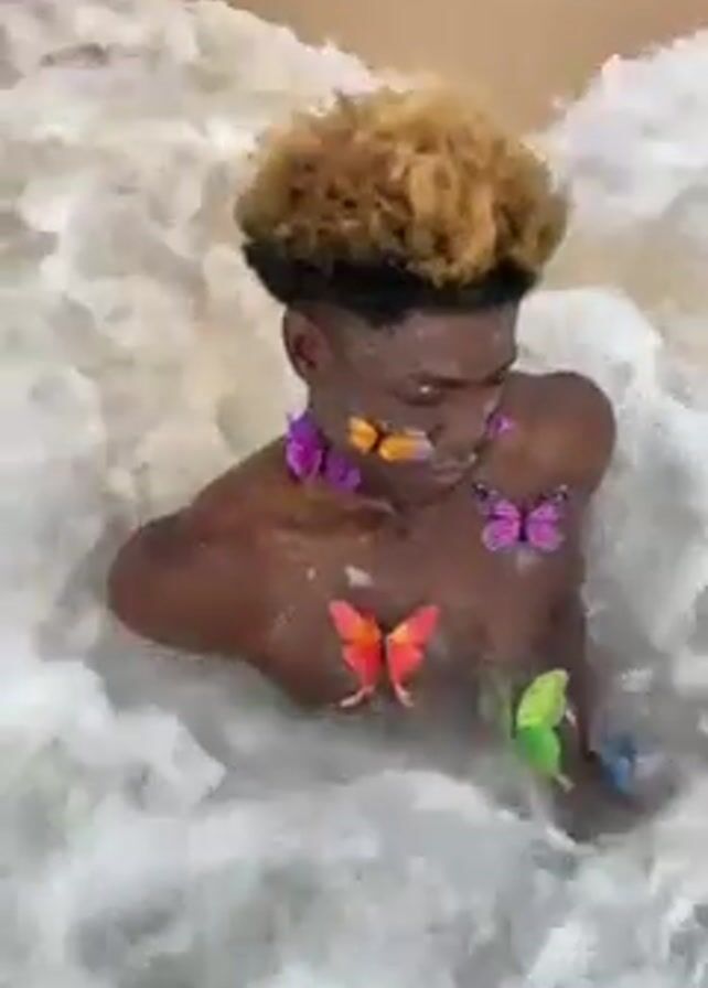 A young man with bleached curly hair lies in shallow, frothy water, presumably at a beach. He has several decorative butterflies attached to his face, neck, and chest. He is looking into the camera, though his eyes are partially closed. The water is a light brown color and the sand is visible in the background. The shot is taken from above.