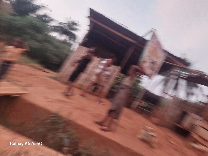 This image depicts an outdoor scene in Umudioka, Nigeria, characterized by significant motion blur and a diagonal tilt. The foreground features reddish-brown dirt ground. Green foliage is visible in the background, below an overcast sky. A single-story structure with a dark, possibly corrugated metal roof is prominent on the right side of the frame. A light-colored banner or sign, featuring indistinct markings, is suspended from the front of this structure. Approximately four to five indistinct human figures are visible. One figure is partially visible on the far left, appearing to wear a light-colored top. Another figure stands center-left, dressed in what appears to be a dark top and shorts. A third figure in the center-right is clad in a light top, with one arm raised towards their head. A fourth figure stands further right, wearing a light top and dark bottoms. The figures appear to be standing or in motion. On the ground in the far left foreground, a flat, light-colored object, possibly wood, is present. Near the feet of the figures on the right, a small, light-colored object, resembling a bag or package, rests on the ground. The bottom-left corner of the image contains a watermark indicating "Galaxy A52s 5G".