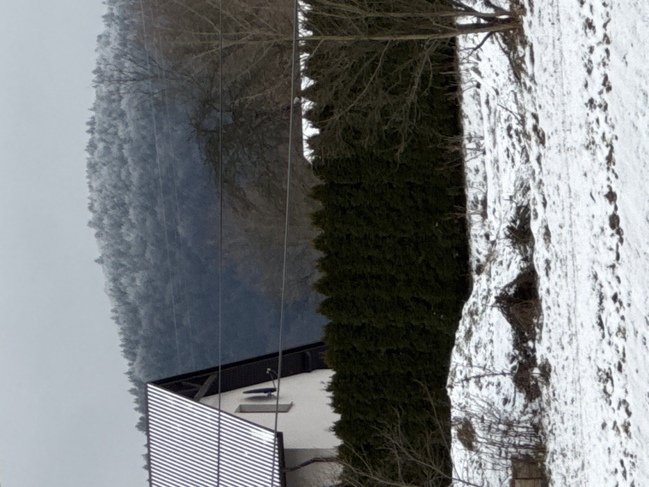The scene depicts a winter landscape in Kasinka Mała, Poland, under an overcast sky. The foreground shows snow-covered ground with visible patches of dark soil and sparse, bare-branched vegetation. In the midground, on the left, a section of a white, multi-story building with a dark-framed gable roof, partially covered in snow, is visible. The building features two rectangular windows and a satellite dish mounted below one window on its visible facade. A dense, dark green evergreen hedge forms a barrier across the central midground. To the right, several deciduous trees with bare branches are present. Multiple horizontal utility lines traverse the midground. The background is dominated by a large hill or mountain densely covered with evergreen trees, which appear frosted with snow or ice, presenting a lighter hue against darker forested lower slopes. No individuals, explicit actions, or interactions are depicted.