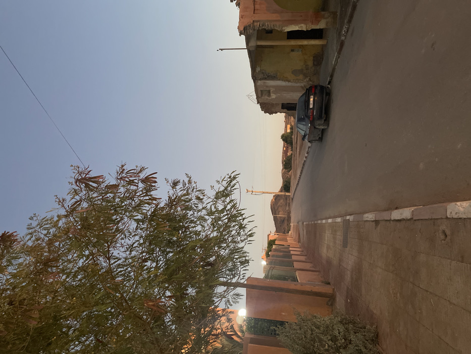 A narrow street curves uphill with a parked car beside a decaying building. A tree dominates the foreground on the left, partially obscuring a low wall with planters. The sky is a gradient of light blue to orange near the horizon. Power lines stretch across the sky. The setting is likely a rural or less developed area.