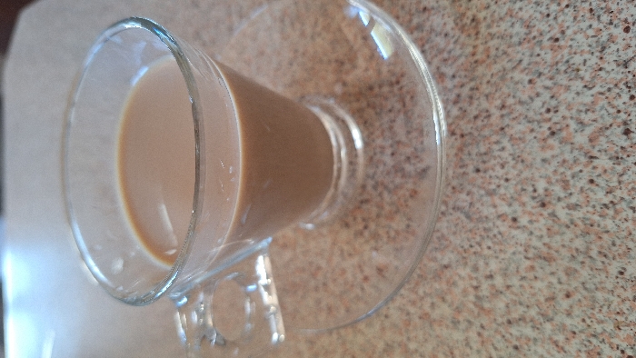 - "A clear glass cup, approximately two-thirds full of a light brown liquid, is positioned on a clear glass saucer" by FM-uUF9A3, licensed under CC BY 4.0