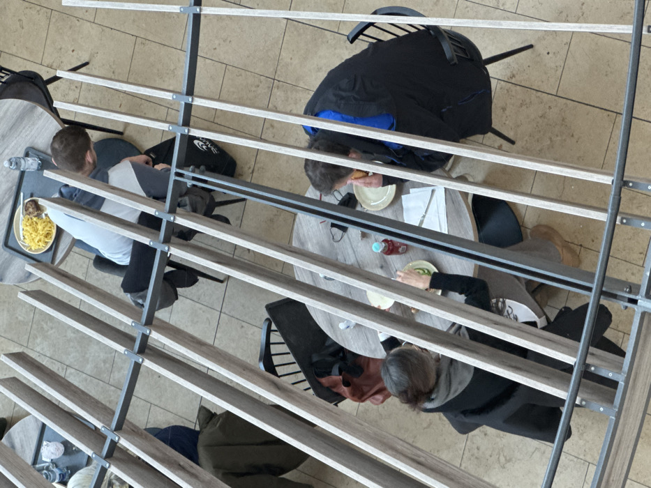 The image displays an overhead, partially obstructed view of a dining area located in the city of Kehl, Germany. The scene is viewed through a foreground architectural element consisting of horizontal, light-colored wooden slats interconnected by a dark metal framework. The floor of the dining area is tiled with light, rectangular-shaped units. Three individuals are present across two separate tables. In the upper right portion of the frame, one individual is seated at a round, light-colored table. This person is viewed from behind, wearing a light grey and white long-sleeved top over blue jeans. A dark grey tray on their table holds a plate containing yellow noodles or spaghetti with a piece of meat, alongside a clear plastic water bottle. A black backpack with visible "RAVAI" lettering rests on the floor beside their chair. In the lower middle section, two individuals are seated at another round, light-colored table. The person on the left, viewed from behind, has short grey hair and wears a black coat with a grey scarf. Their right hand is positioned near a plate containing a partial meal, possibly sandwich components or salad. A red plastic bottle is situated centrally on the table. The person on the right, also viewed from behind, is wearing a dark blue and black jacket and is actively eating, holding a sandwich or burger to their mouth with both hands. A white plate with a napkin and a black face mask are present on the table in front of this individual. A brown bag is positioned on the floor adjacent to this table. All individuals are seated in black chairs with slatted backs.
