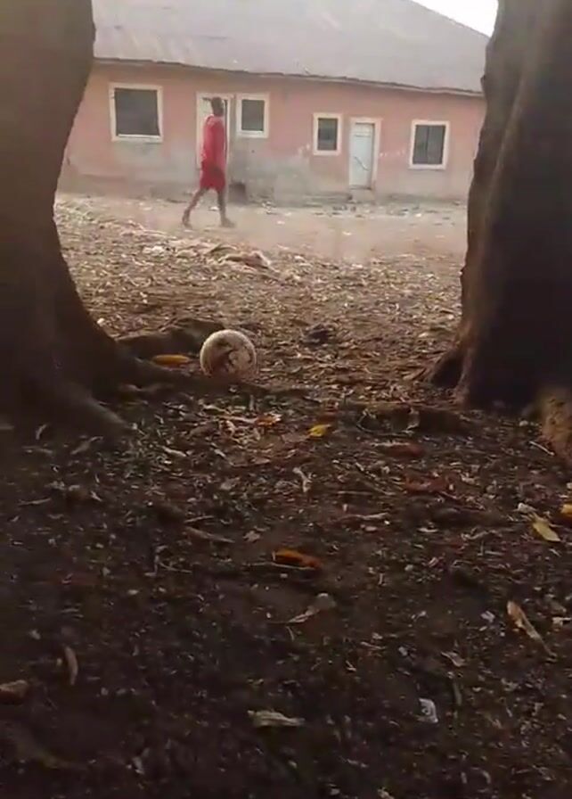 person wearing a yellow jersey and red shorts dribbling a soccer ball on a dirt ground in front of a one-story building. The building is light red with a grey roof and has several windows and two doors. Two trees frame the view, with their roots visible above the ground. A person in a red shirt is walking away from the camera in the background. The ground is covered with dirt, leaves, and what appears to be small pieces of corn.