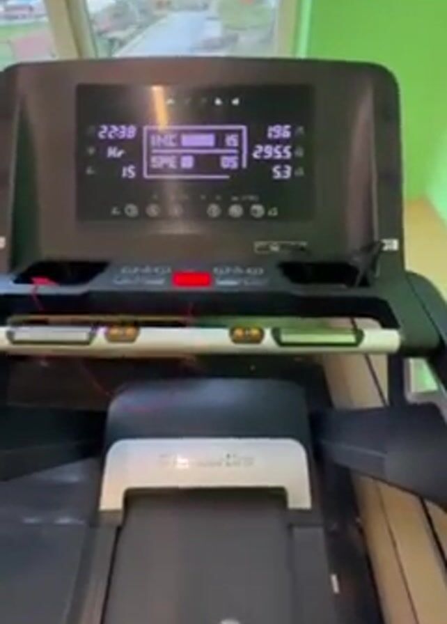 A person in gray sneakers is walking on a treadmill in what appears to be an indoor fitness area. The treadmill's display shows the time, incline (15%), speed (0.5), and distance (5.3 km). The interior has green and white walls, and a window behind the treadmill reveals a view of trees, buildings, and a parked vehicle outdoors.