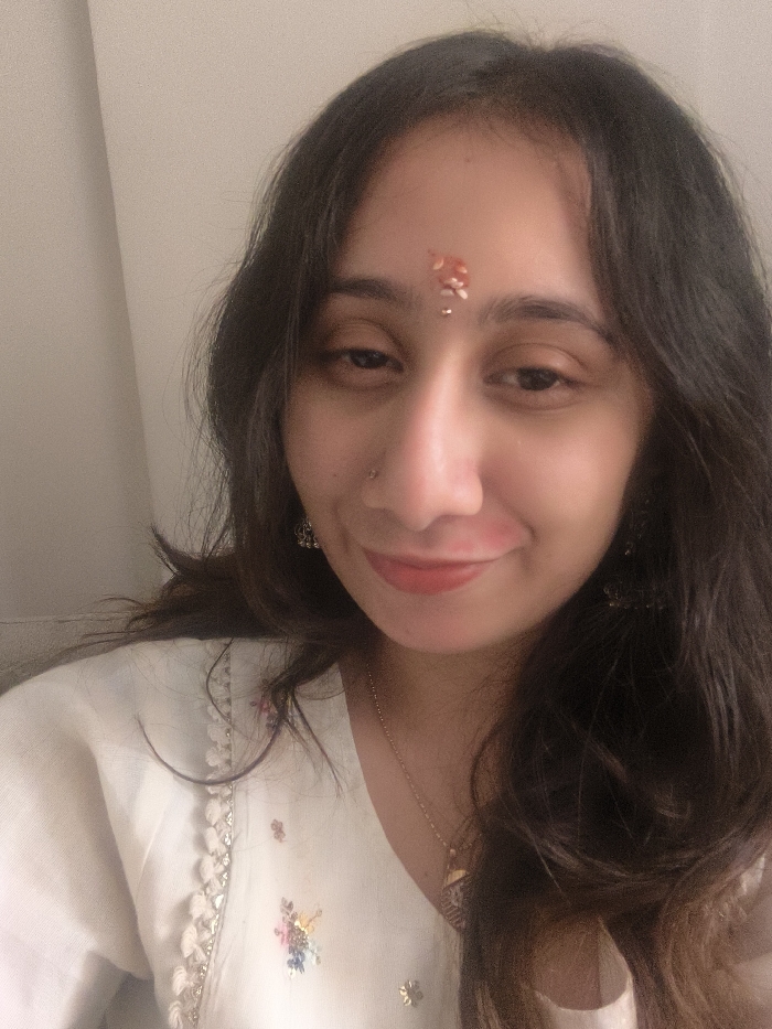 A woman with dark hair and a fair complexion is centered in the frame. A bindi adorns her forehead. She wears a light-colored top with intricate embroidery and lace detailing. A delicate gold necklace is visible around her neck. Small, ornate earrings dangle from her ears. Her gaze is directed slightly downward with a soft smile on her lips. The background appears to be a plain, light-colored wall.