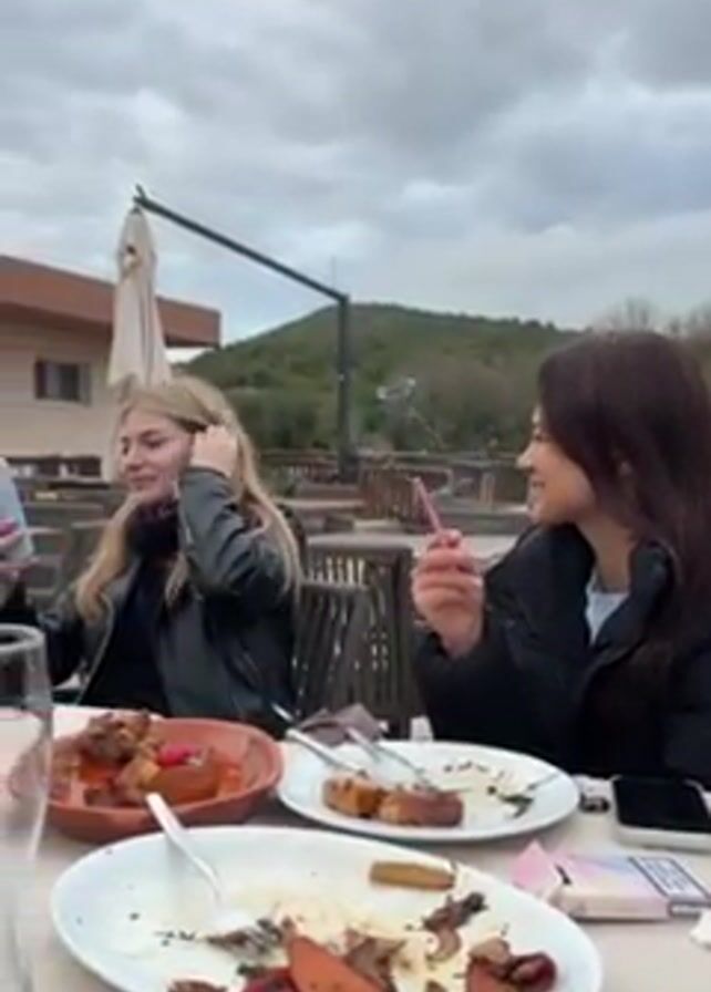 Two young women are sitting at a table on an outdoor patio. The blonde woman on the left is looking at her phone and laughing. The brunette woman on the right is also smiling and holding a pink straw. There are plates of half-eaten food on the table, including some kind of stew, grilled meat, and vegetables. There is also a pack of cigarettes on the table. In the background, there are other tables and chairs, a building, and a wooded area. The sky is cloudy.
