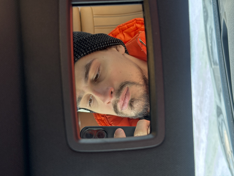 A selfie taken in a car's visor mirror. The person, wearing a black beanie and orange jacket, is visible in the mirror's reflection. Their face is angled downward. The phone used for the selfie is visible, held by a finger. The car's interior, including a tan seat, is partially visible in the background. The mirror frame and surrounding visor structure are also in view.