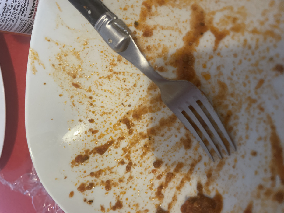 The image displays a close-up, elevated view of a white ceramic dinner plate, post-consumption, positioned on a red surface. The plate's interior is extensively covered with reddish-orange food residue, consistent with a sauce, exhibiting splatters and smears. A four-tined, silver-toned metal fork, featuring a dark handle, rests diagonally across the plate, with its tines oriented towards the lower left. The fork also bears similar food residue. In the upper left background, a crumpled piece of clear plastic wrap is visible. In the upper right background, a partially visible cylindrical Kikkoman soy sauce bottle stands upright. No individuals are present. The scene is an indoor setting in Fegersheim, France.