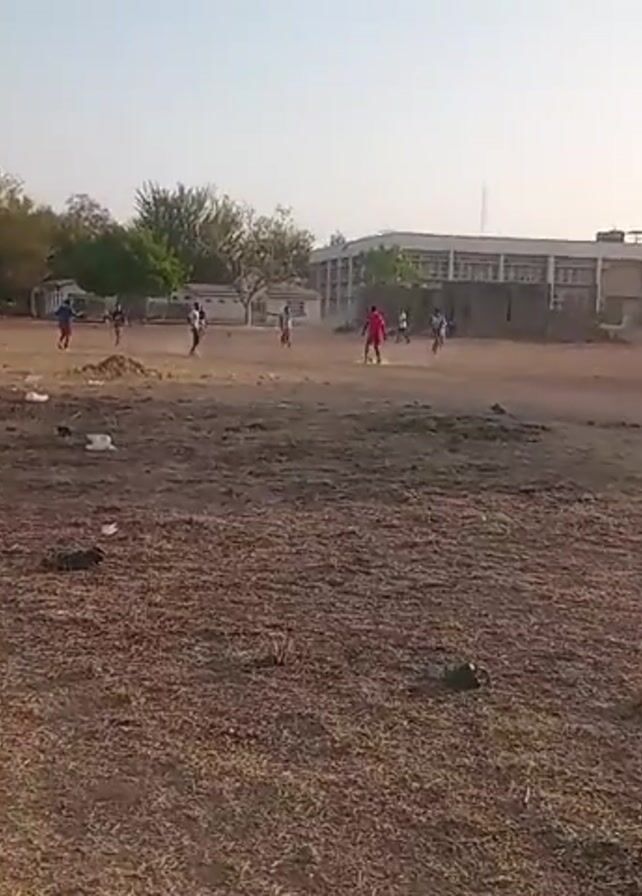 group of people playing soccer on a dry, grassy field with a building in the background. There are several trees scattered around the perimeter of the field. Some trash is scattered on the ground. Two men in dark clothing are walking across the field on a dirt path.