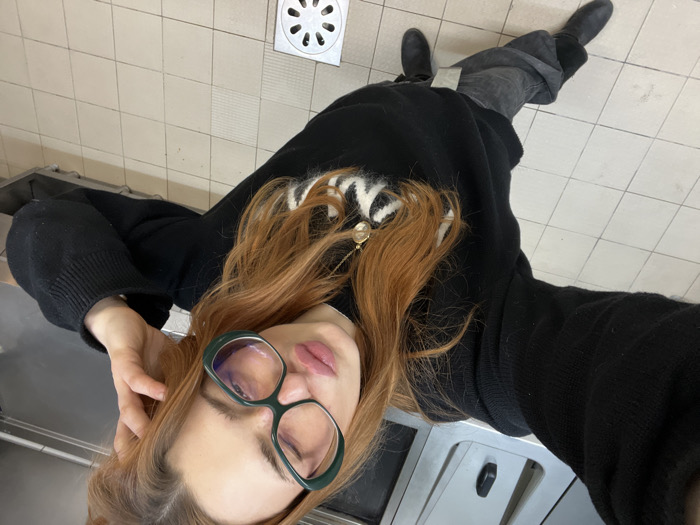 A woman in a black sweater, gray jeans, and black shoes poses in a tilted selfie. She's wearing large, green-framed glasses. Her reddish-brown hair is loose, and a necklace is visible. The background shows tiled flooring and a stainless-steel structure. A round drain is in the upper portion of the image.