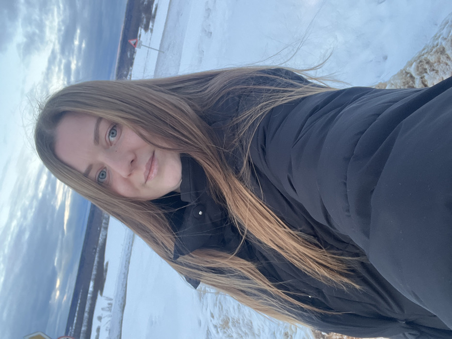 A female individual is depicted in a close-up, selfie-style photograph taken outdoors in a snow-covered landscape near Zubovo, Russia
