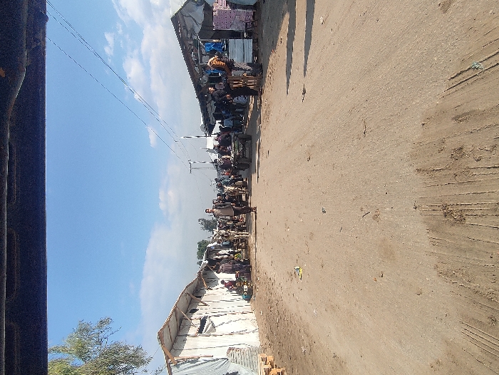 The image captures an unpaved, light brown dirt road in Khan Yunis, Palestinian Territory, under a blue sky with scattered white clouds. The road displays visible tire tracks and scattered debris. Along both sides of the road, numerous makeshift structures are present, constructed from corrugated metal sheets, tarps, and other materials, functioning as stalls or temporary shelters. On the left, wooden pallets are stacked near the structures, and a sparse tree with green leaves is visible. The scene is populated by multiple individuals, primarily adults, who are walking, standing, and engaging near the structures and on the road. In the central thoroughfare, several donkeys are harnessed to two-wheeled carts, some laden with goods, indicating transit or commerce. A man in a dark jacket and light pants is seen walking towards the foreground in the center. On the right side, market stalls display various items, including stacks of pink materials. Overhead, power lines extend across the sky, supported by utility poles in the distance. The environment appears to be an active, informal market or transit hub.