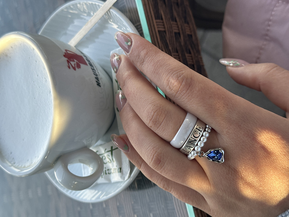 The image depicts a left hand resting on a dark brown, woven-texture table in Šušanj, Montenegro. The hand displays manicured, oval-shaped nails with a translucent pink polish and small light green and white floral or dot patterns. Three rings are stacked on the ring finger: a silver-toned band engraved with "LANCE", a solid white ceramic band, and a silver-toned band adorned with small white pearls. A pear-shaped dark blue gemstone pendant, set in silver-toned metal, dangles from the pearl ring. In the background, a white ceramic cup with a handle, featuring a red stylized teapot logo and "HAUSBRANDT" text, contains a foamy, light-colored beverage. The cup rests on a white saucer, which holds a white sugar packet partially labeled "Pizzeria" and a thin wooden stir stick. Direct sunlight illuminates the beverage foam and casts highlights on the hand and rings. A blurred light pink fabric object is visible in the lower right, and a turquoise-colored edge of a surface is present on the left.