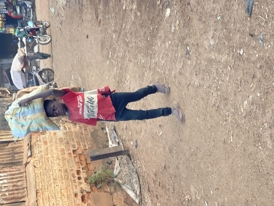 A young person carries a large, patterned sack on their head. They wear a red and white shirt and dark pants with sandals. They walk along a dirt road. A brick wall is visible on one side, and on the other side of the dirt road there are people on motorbikes.