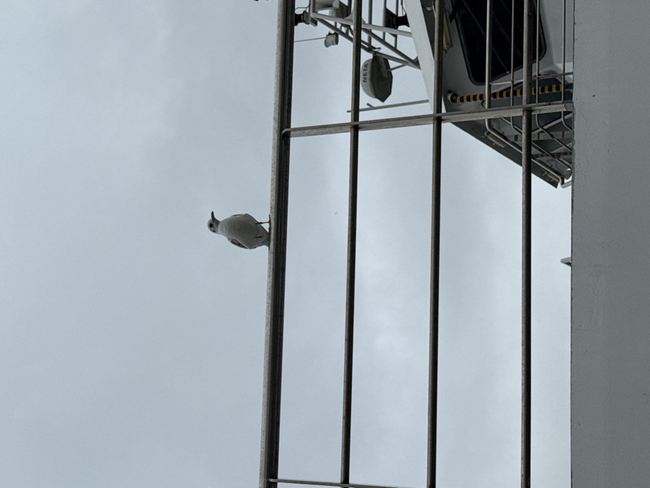 - "The image depicts a white bird, consistent with a seagull, standing on the uppermost horizontal bar of a multi-tiered metal railing" by FM-GGDR63, licensed under CC BY 4.0