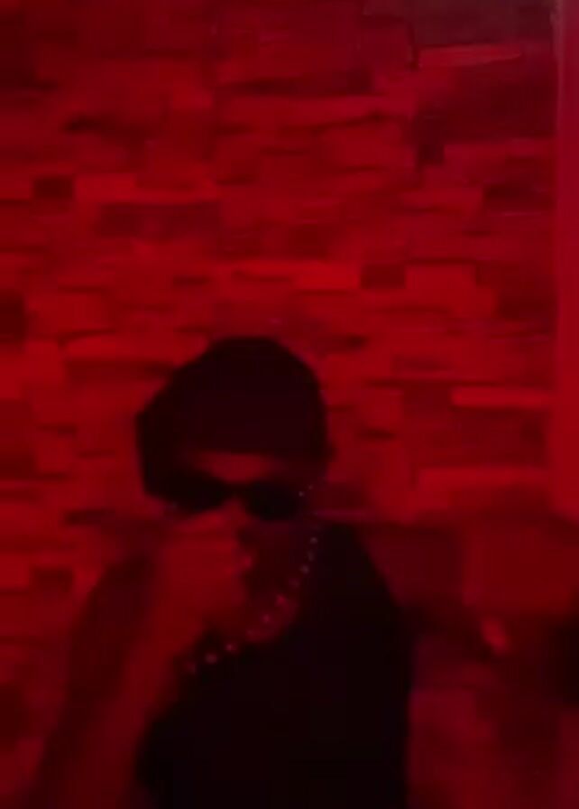 A man emerges from darkness, backlit by a red light against a brick wall. He is wearing a dark baseball cap and a dark tank top, and he appears to be wearing a beaded necklace. He makes some small gestures with his hands.