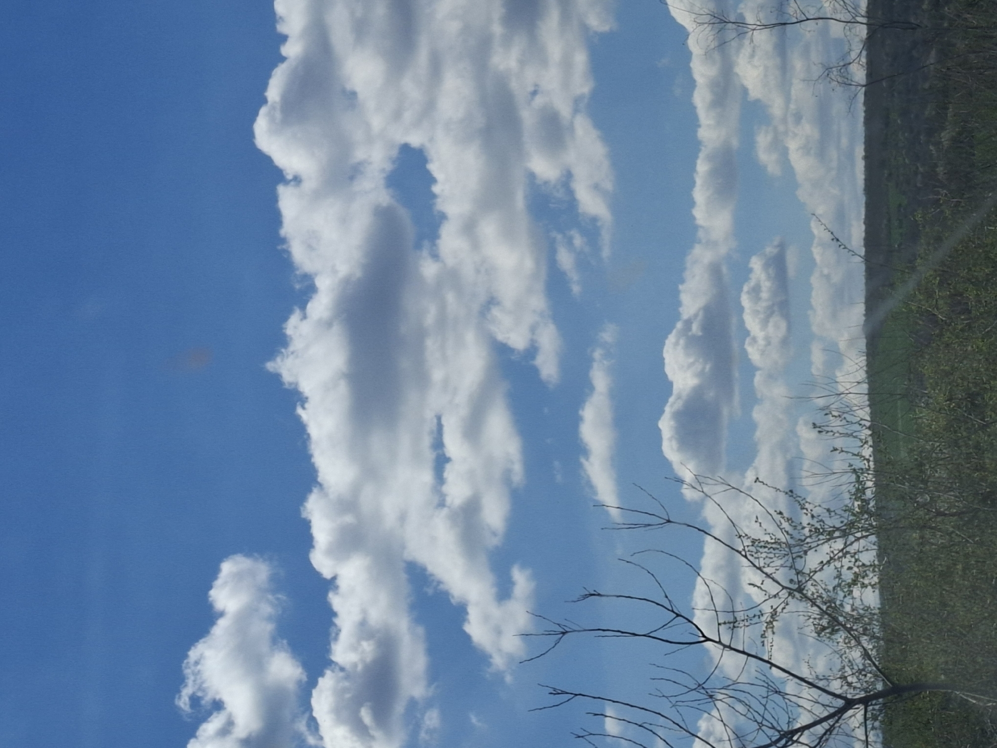 A landscape oriented photo taken outside in Dunavtsi, Bulgaria showcases a bright blue sky partially filled with puffy, white clouds. On the right side, vegetation, including trees with bare branches, frames the sky. The terrain in the background appears somewhat hilly and green.