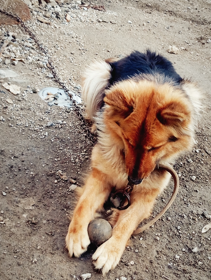 The image displays a medium-to-large-sized dog lying on a dirt and gravel surface. The dog has a thick coat of fur, predominantly tan/light brown on its head, body, and legs, transitioning to a dark brown or black along its back and shoulders, with lighter cream-colored fur on its hindquarters. Its head is lowered, positioned over a spherical, grey, rock-like object situated between its front paws. A metal choke chain is visible around the dog's neck, from which a heavy, rusted metal chain extends towards the upper left of the frame, indicating the dog is tethered. A curved, light-colored rope or cord is also present near the dog's chest. The ground consists of light brown, uneven dirt interspersed with small to medium-sized stones and gravel. In the upper left quadrant, near the chain, a partially visible, shallow, light-colored dish-like object is embedded in the ground. The scene is illuminated by natural, diffused light. The location is Lassan, Pakistan.