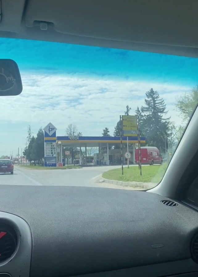 view from inside a car, likely on a road trip. A gas station is visible in the distance, with its price sign displaying costs for Diesel Extra, Diesel, Blue, and AdBlue. There are signs pointing toward a direction or location called "Vlahi". The sky is partly cloudy. There appears to be music playing inside the car.