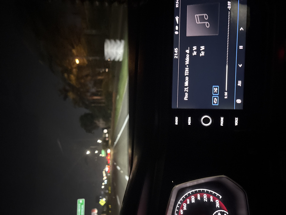 A nighttime view from inside a car. The dashboard is visible with an infotainment screen displaying music information: "Piso 21, Micro TDH - Video di..." and the song title "Te Vi." The screen also shows playback controls and the current time. Below the screen are buttons labeled "RADIO," "MEDIA," "PHONE," and "VOICE." The speedometer is visible, indicating a speed of around 0 km/h. The view through the windshield shows a dark road with streetlights and approaching traffic.