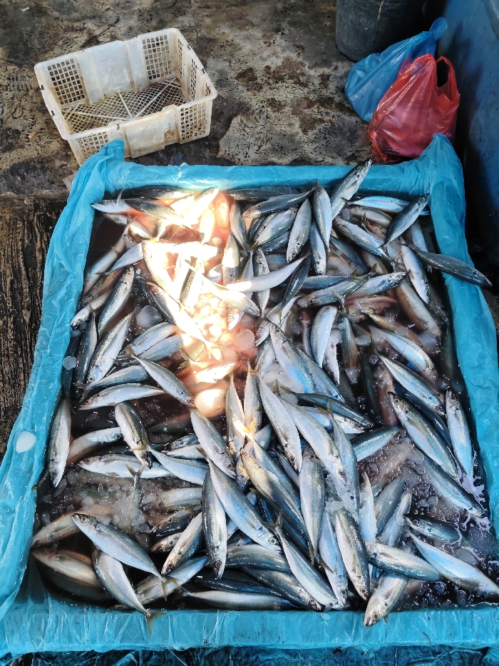 A high-angle photograph depicts a quantity of fresh fish in a blue-lined rectangular container on a dark, textured ground surface