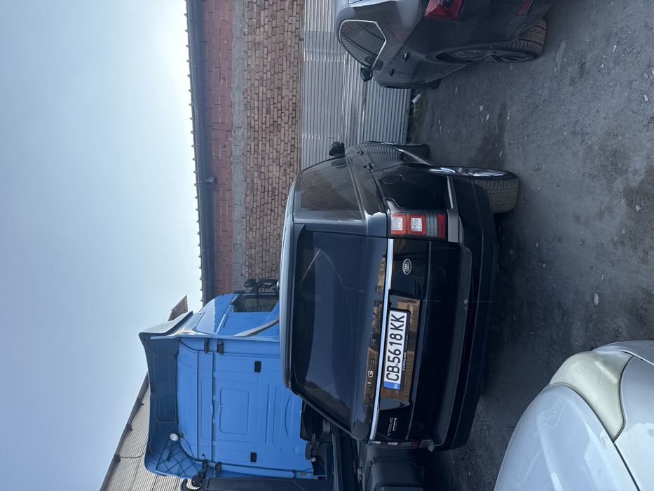 The scene depicts an outdoor parking area under clear daylight conditions. In the midground, a black Range Rover Vogue is prominently featured, observed from its rear. Its rear window exhibits a significant, multi-point fracture pattern. The vehicle displays a Bulgarian license plate, "CB 56 18 KK," with "CB" denoting Sofia City. To the left and partially obscured behind the Range Rover, the blue cab of a semi-trailer truck is visible. To the right, the rear section of a dark-colored sedan is partially visible. In the immediate foreground, the front bumper and headlight of a silver vehicle are partially visible on the lower left. The background consists of a brick wall, partially rendered with a horizontal concrete band, topped by a corrugated metal structure. Further to the left in the background, another corrugated metal building or roof is present. The ground surface is unpaved, consisting of dirt and gravel. No individuals are visible, and all vehicles appear stationary.